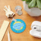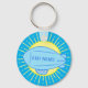 Estilo de desenho de desenho azul de desenho animado. Sol amarelo brilhante no fundo. Chaveiros personalizados. Edite o nome no balão para personalizá-lo. Ideia do presente.