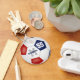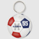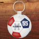 Este chaveiro de futebol esportivo para meninas ou meninos apresenta uma bola de futebol tradicional com painéis vermelhos, brancos e azuis - personalize o nome do jogador, o monograma e o número de camisa - por katz_d_zynes