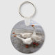 Foto de Zolotareva.Ganso branco na neve branca.Gansos são engraçados.