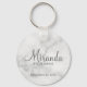 Adicione um toque pessoal ao seu casamento com chaveiro de madrinha personalizada. Este chaveiro apresenta o nome personalizado da dama de honra no estilo de fonte moderna da cinza com o título e a data de casamento no estilo de fonte sans moderno da cinza em fundo de mármore branco. Também perfeito para a madrinha de casamento, mãe da noiva e muito mais. Observe que os detalhes do mármore são simulados no trabalho de arte. Não será utilizado nenhum mármore real no fazer deste produto.