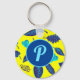 Blue and yellow tropical leaf pattern on personalised keychain.