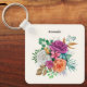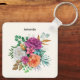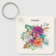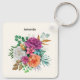 Uma corrente chave com um arranjo floral contendo rosas bonito, cor-de-rosa, laranja e brancas rodeadas por folhas verdes.