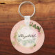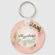 Uma corrente chave com um buquê de rosa floral com flores brancas e cor-de-rosa. O fundo é rosa com um padrão floral. Bonito e elegante design. Um círculo branco semitransparente colocado sobre o topo com uma borda falsa de folha de ouro. Personalize com um nome.