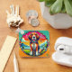 Ilustração admirável ao estilo cartoon de um cão com olhos brilhantes, vestindo uma coleira e uma corrente, colocada contra um fundo circular colorido.