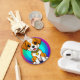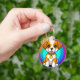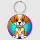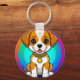 Um cachorrinho de desenho animado fofo com uma coleira dourada, sentado contra um fundo radial brilhante e colorido, exala charme e felicidade.