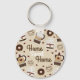 Uma bela xícara de café a vapor e pote de café correspondente no chaveiro "Home Sweet Home".