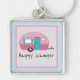 Ilustração de trailer RV, cor-de-rosa, desenhado à mão, com texto "Happy Camper" sobre fundo azul claro