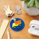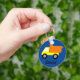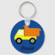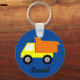 Um belo caminhão de brinquedo. Cadeias de chave personalizadas. Fundo azul. Edite o nome para tornar personalizadas estas cadeias-chave. Ideia de presente para crianças.