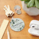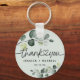 Verde claro empoeirado com chaveiro de folhas de eucalipto pintadas à aguarela com agradecimento com coração conectando nome e data. Ideia perfeita para lembranças de casamento ou presentes para convidados em qualquer ocasião.