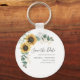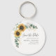 Crie um moderno Floral de Girassol salve a data chaveiro com este lindo modelo com um belo buquê floral rústico, estrutura geométrica de efeito de ouro, com a moderna tipografia simples. DICA: Cartões de suíte de casamento iguais, como RSVP, programas de casamento, banners, tapeçarias, etiquetas de presentes, placas e outras pegadas de casamento e guloseimas estão disponíveis na coleção abaixo com esta design.