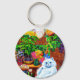 Chaveiro com a pintura de animais de Louis Wain Master of Cat College (1860-1939). Um gato branco pensativo com olhos azuis impressionantes senta-se pesadamente ao lado de uma variedade vibrante de flores bonitas. A majestosa faculdade de gatos venta no fundo sob um céu rosa e azul. Um presente maravilhoso para amantes de gatos e arte inglesa.