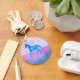 Um chaveiro com um cavalo de aquarela bonito em cores azul e roxo. Correndo selvagem e livre. Colocado sobre um fundo horizontal listrado roxo com um talho de vintage. Uma borda de aquarela azul e cor-de-rosa colocada na parte inferior.