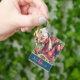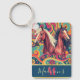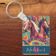 Este chaveiro apresenta dois cavalos com cabelos pretos e brancos colocados sobre um fundo artístico colorido. Você pode personalizar o nome e o monograma para ajustado do seu uso.