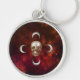Na moda chaveiro apresenta a ilustração do crânio vintage do gótico Magik com quatro luas de crista prateada sobre fundo celeste vermelho.
