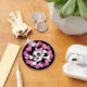 Caveira fofa e ossos cruzados com laço de bolinhas rodeado por corações e flores cor-de-rosa.