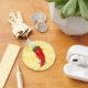 Um personagem de desenho animado de pimenta vermelha e quente. Design original com padrão de renda dourada (impressão amarela) ao fundo.