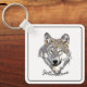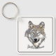 Este chaveiro de alumínio é mostrado com um design de impressão de lobo amarelo-pedra. Personalize este item ou comprar como está. Escolha entre muitos estilos. Imagem do stock