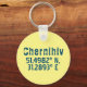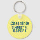 Chaveiro design apresenta as coordenadas de latitude e longitude de Chernihiv, Ucrânia com uma fonte azul escura e angustiante sobre fundo amarelo. Chernihiv está localizado no Norte da Ucrânia e foi apelidado de "A cidade das lendas".