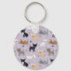 Cães chihuahua bonitos em preto, marrom, bronzeado, creme, cinza e casacos azuis sentam-se e ficam espalhados por ossos de cachorro e estampas de pata em um fundo roxo claro.