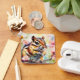 Esquilha falante sobre um pequeno galho com a boca aberta. As flores cor-de-rosa se movem para um fundo de lavagem com aquarela. A mesma imagem invertida horizontalmente no verso. IA gerada.