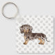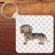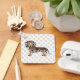 A ilustração original de Destei de um bonito cabelo, chocolate castanho e casaco de maçã bronzeado, cão da raça Dachshund. Há também uma área de texto personalizável para um nome no outro lado. O fundo tem um padrão de pegadas de cinza.