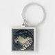 Um elegante chaveiro quadrado imaginando uma paisagem chinesa tridimensional em tons de cinza.