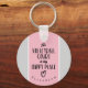 Este chaveiro de vôlei bonitinho com nome personalizado apresenta a frase "A quadra de vôlei é o meu lugar feliz" em preto com um pequeno coração puxado à mão sobre uma faixa vertical muito rosa - fundo é cinza de luz - por katz_d_zynes | procurar no meu compro "local feliz do campo de vôlei" para ver mais produtos com este design/ frase da tipografia de vôlei | parte da coleção de Chaveiros de vôlei de katzdzynes >> https://www.zazzle.com/collections/119042498553482541