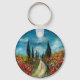 Paisagem da Toscana, colorida, vibrante, expressiva beleza do campo italiano, colinas verdes, céu azul, nuvens, campos de papoila, campos de flores, pintura acrílica em amarelo brilhante, laranja, vermelho, cores azuis na canvas redonda.