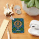 Crachá da crista Clan Colquhoun rodeado por uma correia e fivela sobre fundo tartano. Texto personalizado de ambos os lados.