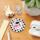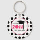 Um chaveiro com design de fundo de bolinhas pretas sobre branco. Texto "Classe de 2011" com quadro cor-de-rosa dentro de ilustração do boné de formatura preto. Personalize com seu nome.