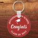 Chaveiro de graduação com um boné de formando branco, a palavra felicita o seu nome de segundo grau personalizado e a sua classe de ano. O presente comemorativo perfeito para celebrar o novo formando ou uma turma inteira de formandos. O fundo atual é vermelho, mas é facilmente alterado para corresponder às cores da sua escola.
