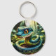 Cobra de bebê bonito em estilo cartoon em uma floresta (por AI) + Feliz ano novo em inglês em fundo faux-bois (para o elemento madeira do ano de 2025). Design no chaveiro básico redondo. Cartão de saudação e cartão postal de feriado. Perfeito para o Ano Novo Chinês do Cobra 2025 ou Aniversário (nascer pessoas no Ano Cobra).