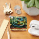 Cobra de bebê bonito em estilo cartoon em uma floresta (por AI) + Feliz ano novo em inglês em fundo faux-bois (para o elemento madeira do ano de 2025). Design no chaveiro básico quadrado. Cartão de saudação e cartão postal de feriado. Perfeito para o Ano Novo Chinês do Cobra 2025 ou Aniversário (nascer pessoas no Ano Cobra).