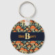 Corrente-chave personalizada com uma ilustração dos cogumelos retrorreflectores, flores de safra em cores antigas de azul escuro, laranja e bege.