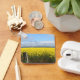 Um campo de flores amarelas brilhantes se estende sob um céu parcialmente nublado, com montanhas visíveis à distância. Uma cerca de madeira no primeiro plano adiciona um toque rústico à paisagem. Esta imagem foi tirada perto de Ararat, em Victoria, Austrália.