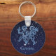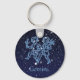 Chaveiro com o símbolo do zodíaco de Gemini em azul-prata suave, sobreposto com as estrelas da constelação, contra um fundo do céu estrelado formando de azul-da-meia-noite para preto.