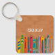 Create a small personalized gift for your favorite skier when you add their name to this keychain. It features my hand-drawn illustrations of vintage skis in an assortment of colors set against a light brown background that has the look of a ski lodge's wood siding.