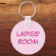 Chaveiro do quarto das senhoras com um texto cor-de-rosa escuro sobre fundo rosa. O chaveiro de quarto dos Homens está disponível.