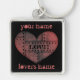 Corrente de chave bonita com coração acinzentado para se parecer com folhas de metal intactas amaldiçoadas unidas em tons vermelhos esmaecidos e cinzas sobre fundo preto com a palavra "Amor" sobre ele. Você pode colocar o seu nome e os nomes de outros importantes nele ou em outro texto.