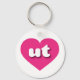 Este chaveiro apresenta um coração rosa-quente vibrante contendo as letras maiúsculas, brancas e em negrito, arredondadas, uma abreviação lúdica para Utah, o estado da colmeia.