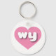 Este chaveiro apresenta um coração cor-de-rosa tranquilo e legal contendo as letras em negrito, branco, arredondado, letras minúsculas, uma abreviação lúdica para Wyoming, o estado de igualdade.