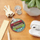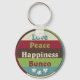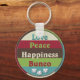 Leve sua própria cadeia de chaves Bunco sortuda para seu próximo evento Bunco. O design moderno apresenta três dados brancos do Bunco juntamente com as palavras: Amor, Paz, Felicidade e Bunco. Excelente como prêmio Bunco ou a favor do partido.