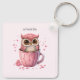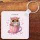 Uma corrente chave com uma imagem adorável de uma coruja sentada numa caneca de café. Corações pairando e um rosa solteiro colocado no fundo da xícara.