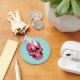 Botão do crânio bonito com uma ilustração de desenho animado de um crânio rosa engraçado com ossos rosados e dois fantasmas bonitos em seus olhos olhando uns para os outros e sorrindo, uma pequena aranha adorável em cima de um desses amigos assustadores. Esta design macabra divertida tem cores rosa e azuis.
