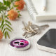Este crânio roxo adorável do açúcar é decorado com redemoinhos e gotas tribais com um grande coração no meio da testa. Um único rosa do rosa senta-se no lado do crânio redondo apenas acima dos grandes olhos roxos. Os pedais violetas da flor cercam os olhos e a boca tem os pontos que fazem sua maneira acima do lado do mordente. O crânio senta-se sobre um profundo - fundo roxo que cria um contraste bonito. Este design do chaveiro é um exemplo loveable deste dia do símbolo inoperante.