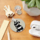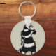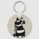 Chaveiro de gato assustador com um desenho de tinta representando um estranho gatinho listrado preto e branco com pescoço longo segurando uma máscara de crânio. Parece que uma de suas luvas está fora e sua mão esquelética mostra de sua manga. Pergunto-me se é muito mais uma criatura assustadora do que finge estar no Halloween.
