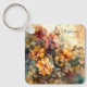 Carry beauty with this romantic watercolor key chain of orange, yellow, pink, and red flowers on a beige-blue-green background. Add your name or message for a sleek, custom touch, perfect for floral lovers with meaningful, vibrant style.