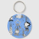 A fun and playful illustration featuring adorable keychains in cartoon style — from stars and cassette tapes to cute animal and character charms. Set against a light blue background with a retro pop-art touch.