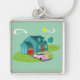 Este padrão de Chaveiro da Casa Suburbana Retroativa apresenta uma típica casa americana em um típico bairro americano, por volta de 1950. Uma casa de chá com um telhado azul de pavão, e janelas de turquesa são perfeitamente compensadas por uma porta vermelha vibrante e porta de garagem. Um carro convertível clássico, cor-de-rosa, da década de 1950, está estacionado na passarela pitoresca. Kitschy, plástico, flamingos cor-de-rosa olham bem em casa na forma de bumerangue de grama verde recém-aparada descansando sobre um fundo de jade. O relvado manicurado é paisagístico com árvores brancas. Nuvens em forma de feijão e uma explosão de sol amarela de um sol que vos permite saber que é apenas mais um glorioso dia nos subúrbios modernos do meio século.