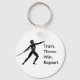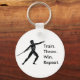 Uma corrente de chave redonda com um gráfico de um atleta grego a preparar-se para lançar uma lança com as palavras "Comboio. Jogue. Ganhe. Repita." Definitivamente a fórmula de vitória universal para qualquer desportista.